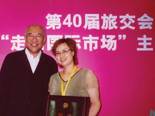 第四十届国际旅交会中国工艺美术协会理事长石小光先生为钱菊萍颁奖